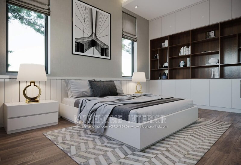 Phòng ngủ được thiết kế với tone chủ đạo là sắc trắng hiện đại và bố trí nội thất cao cấp gây ấn tượng mạnh trong ngôi nhà phố.