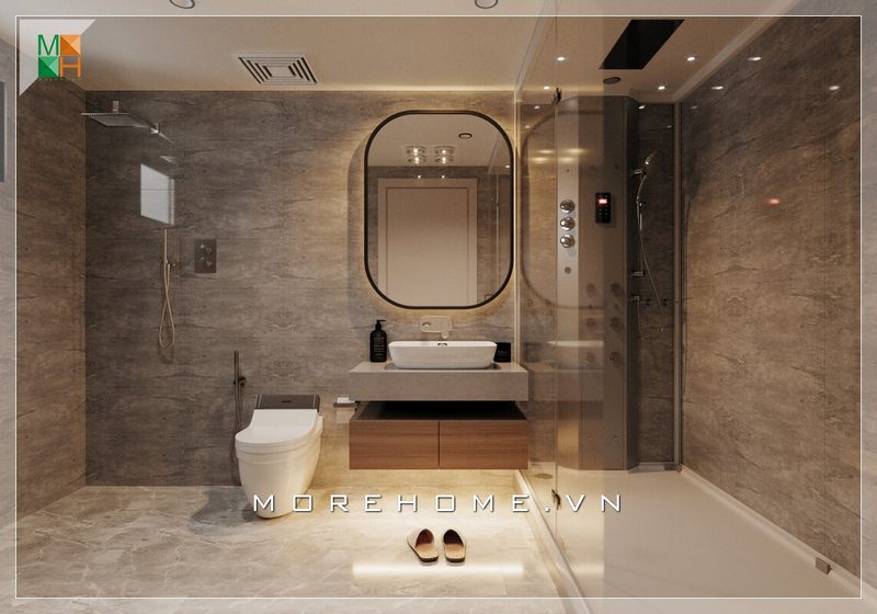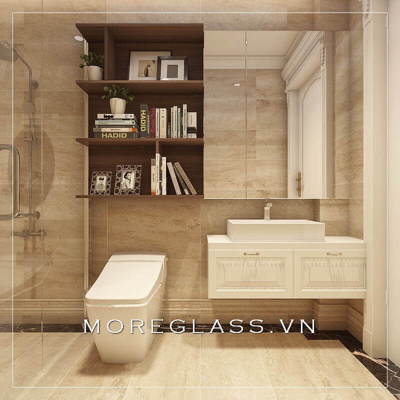 Phòng tắm hiện đại được thiết kế với những kệ tủ trang trí, tủ lavabo đơn giản nhưng hiện đại, cùng với các thiết bị vệ sinh và phòng tắm kính đẹp.