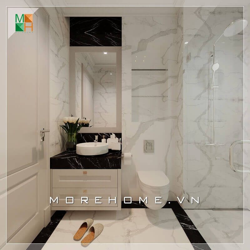 Mẫu thiết kế phòng tắm đơn giản được kết hợp với kệ tủ và các thiết bị vệ sinh cao cấp, nhỏ gọn.