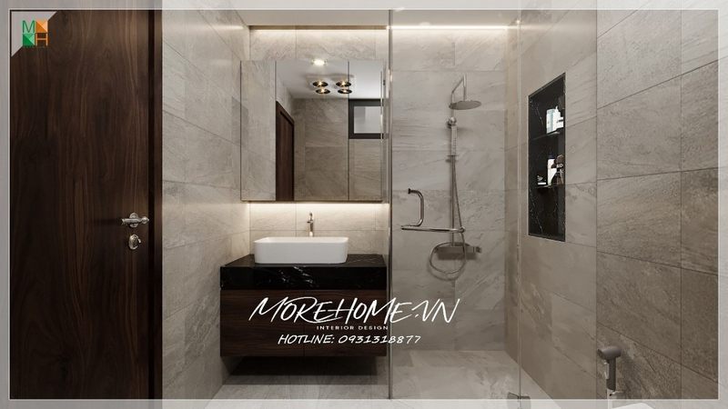 Phòng tắm hiện đại được thiết kế với các kệ tủ trang trí, tủ lavobo gỗ công nghiệp cao cấp và các thiết bị vệ sinh thông minh, giúp căn phòng tắm trở nên đầy đủ tiện nghi.