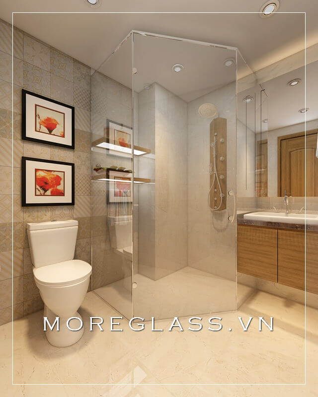 Vách tắm kính 180 độ được đặt giữa không gian phòng tắm để ngăn chặn nước văng làm ướt át tới các khu vực khác trong phòng.