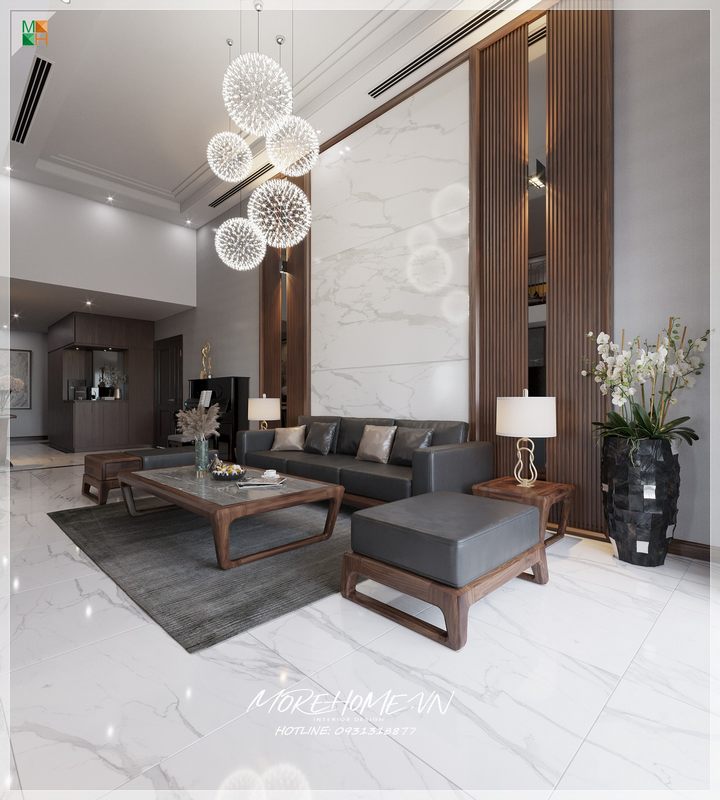 Mẫu thiết kế phòng khách biệt thự có phong cách tân cổ điển sang trọng, mang đến sự lôi cuốn cao cấp.