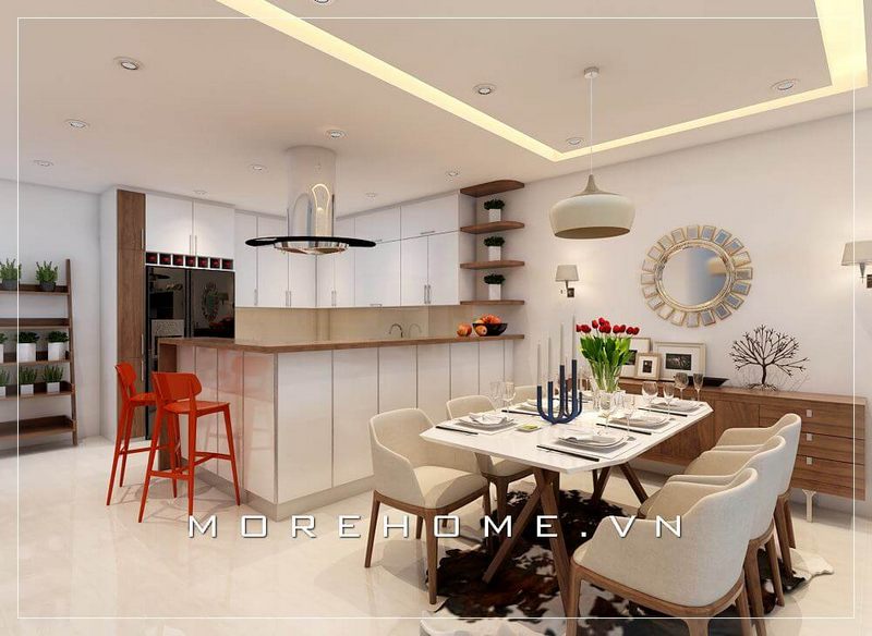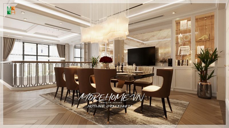 Phòng ăn được thiết kế theo phong cách hiện đại, kết hợp với tông màu trung tính đã tạo nên một không gian phòng ăn đẳng cấp, hiện đại và thu hút đến mọi gia đình.